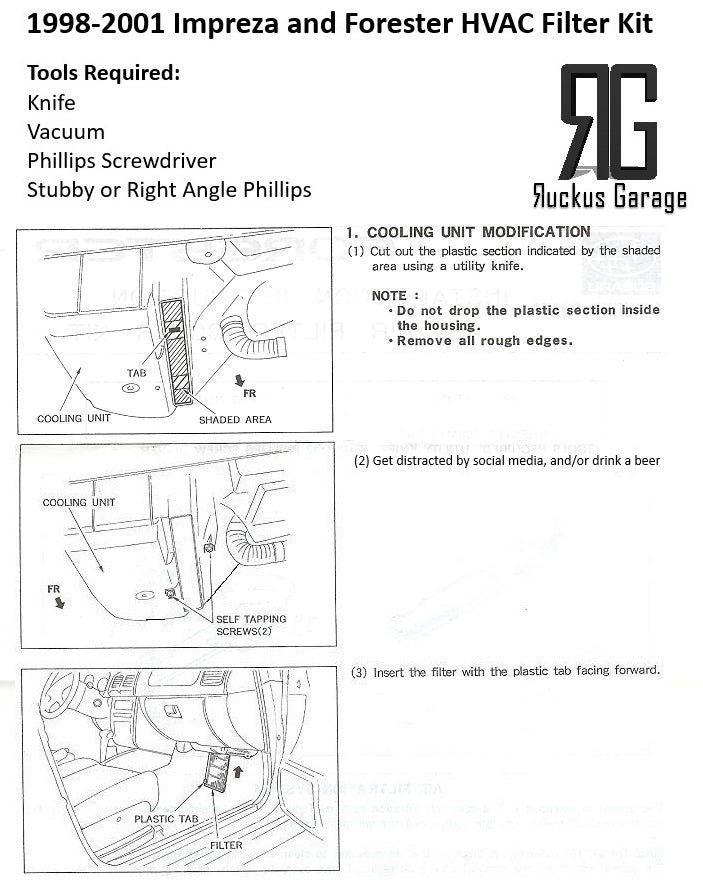USDM "GC" Imprezas and Foresters didn't come with a cabin filter from Subaru. This kit allows you to add one quickly and easily with basic hand tools!